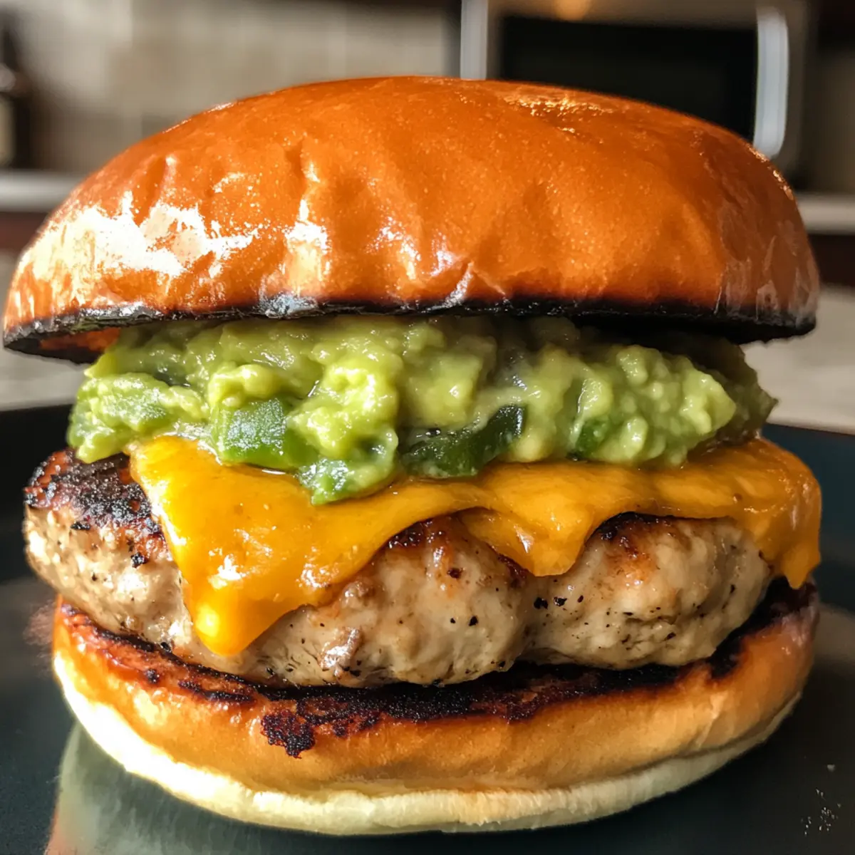 - After grilling, let the turkey burgers rest briefly, then assemble each patty on a bun topped with guacamole.