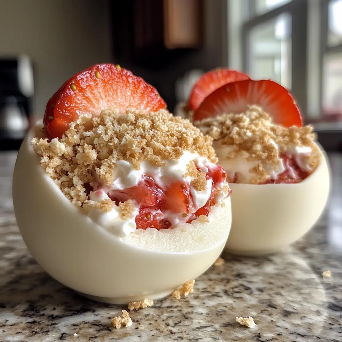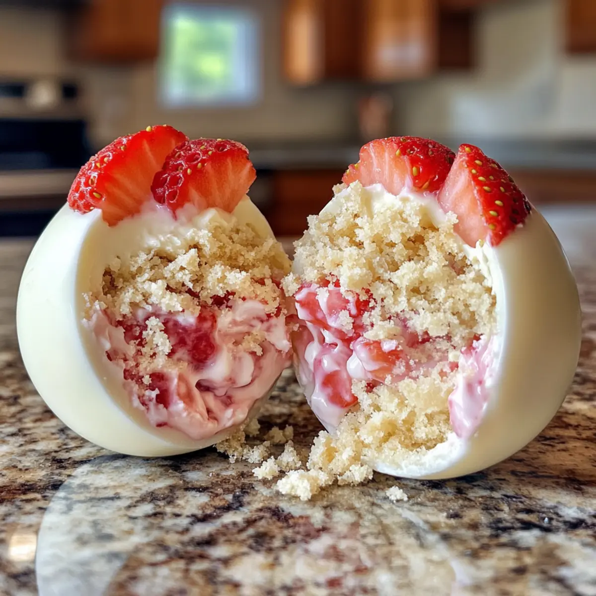 - Once chilled, take 2 ounces of melted pink candy melts and drizzle them over the assembled eggs for a decorative flair. Sprinkle with additional crushed shortcake crumbs, then top each bomb with fresh strawberry slices and optional edible gold sprinkles for that festive touch. Serve them chilled and delight in the beautiful presentation of your Strawberry Shortcake Easter Egg Bombs!