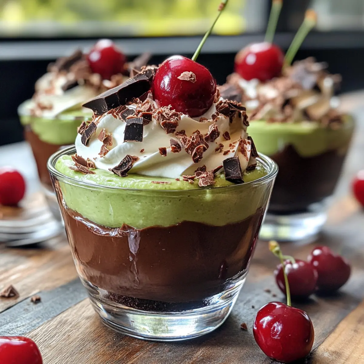 4. Assemble Cups: Layer whipped cream, avocado mousse, and cherries in serving glasses.