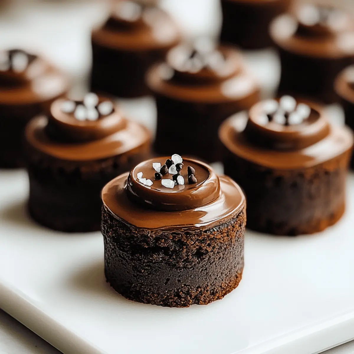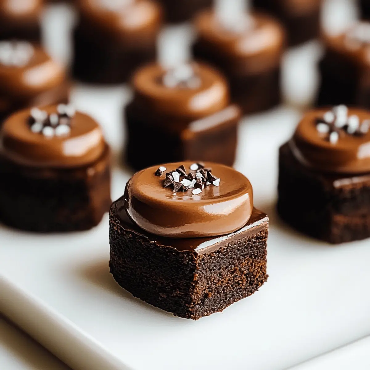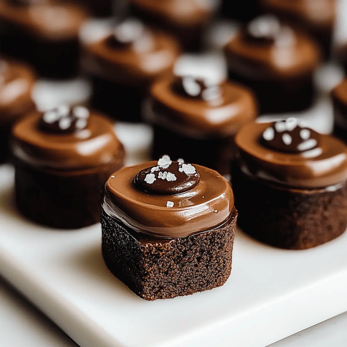 Before the ganache sets, sprinkle a touch of fleur de sel or sea salt over each brownie petit four. This final step enhances the chocolate flavor and adds a delightful contrast. Allow the ganache to fully harden at room temperature before serving, creating an exquisite bite with a crunchy shell surrounding the fudgy center. Enjoy this elegant dessert!