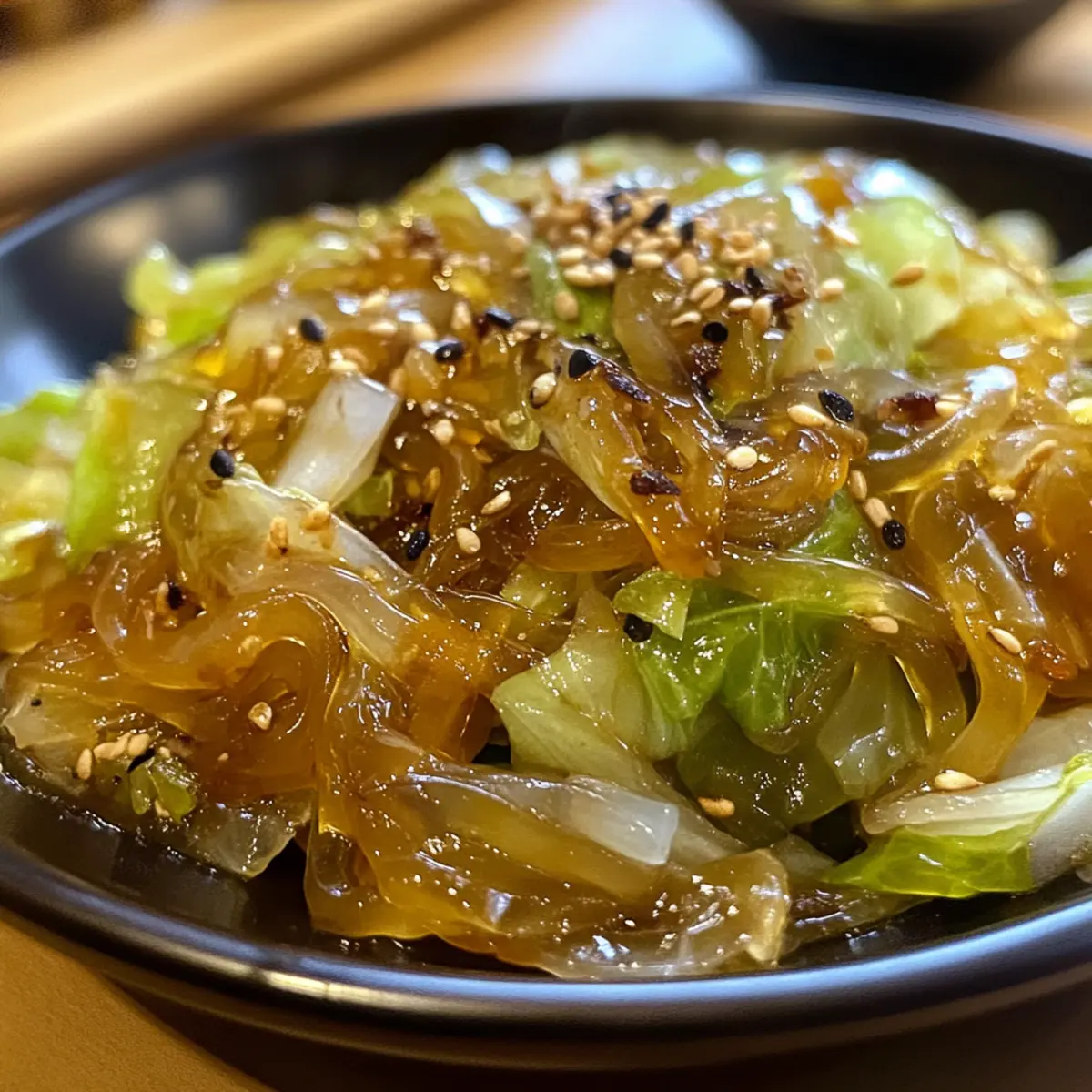 A delightful and quick Cabbage Glass Noodle Stir Fry featuring mung bean noodles and crunchy cabbage.