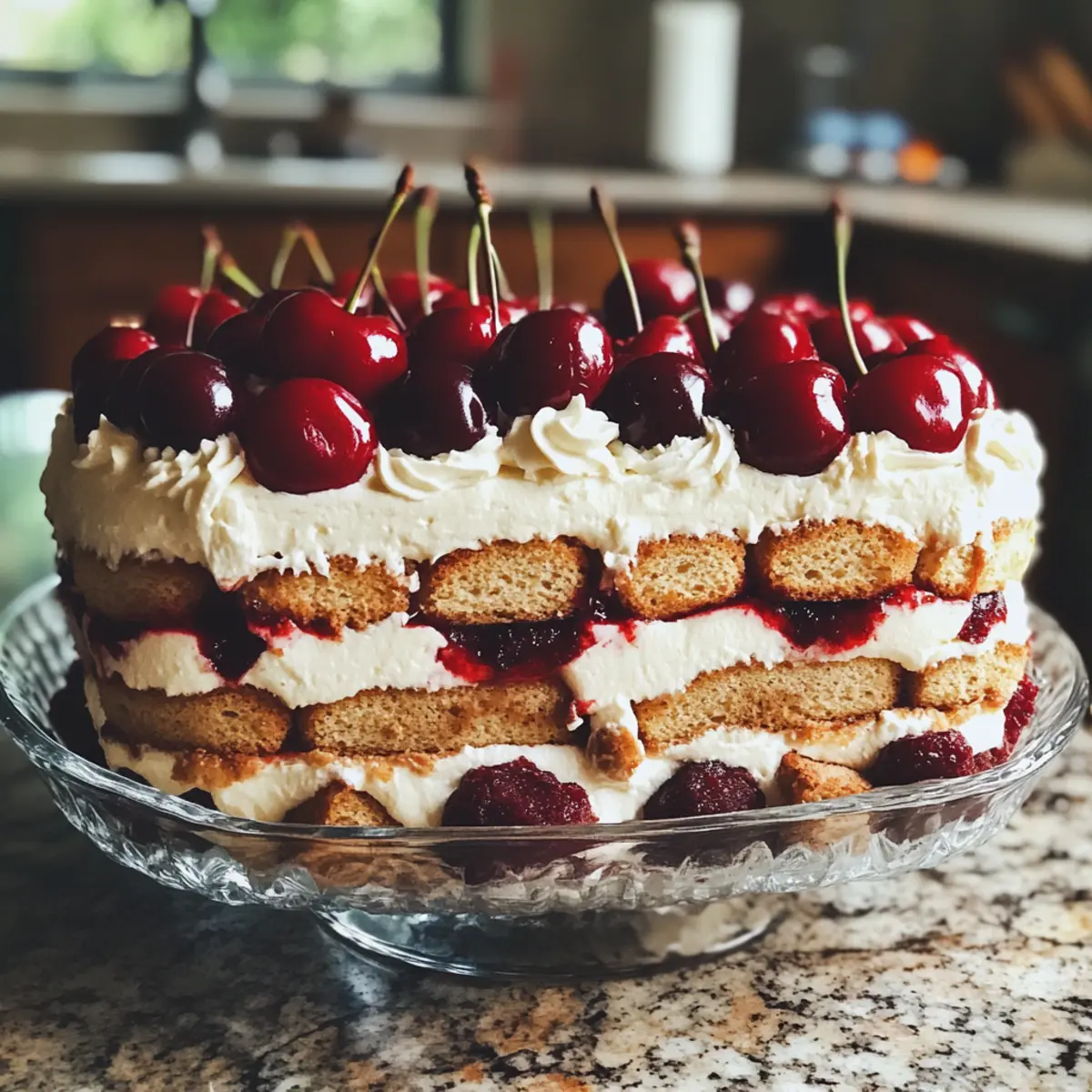Quickly dip each ladyfinger into the espresso-Amaretto mixture for just 1–2 seconds per side to soak without getting too soggy. In a medium-sized dish, start layering by placing the soaked ladyfingers at the bottom, followed by a generous layer of the mascarpone cream, and then some of the cherry mixture. Repeat the layers until all ingredients are used, finishing with a layer of mascarpone cream on top.