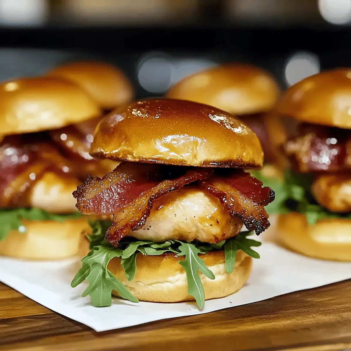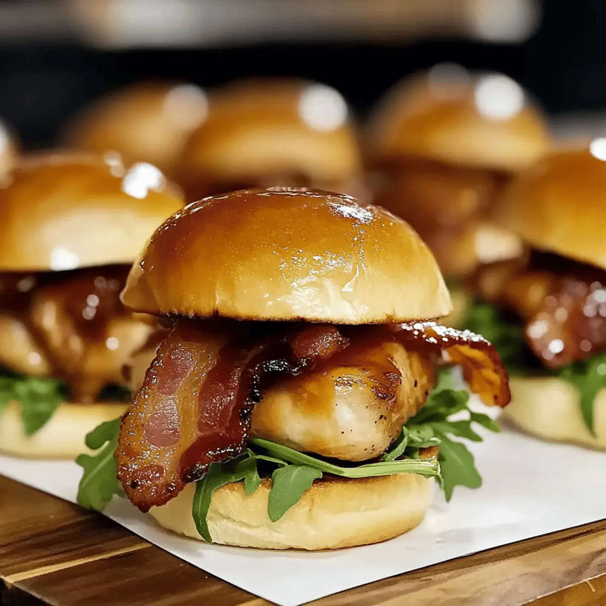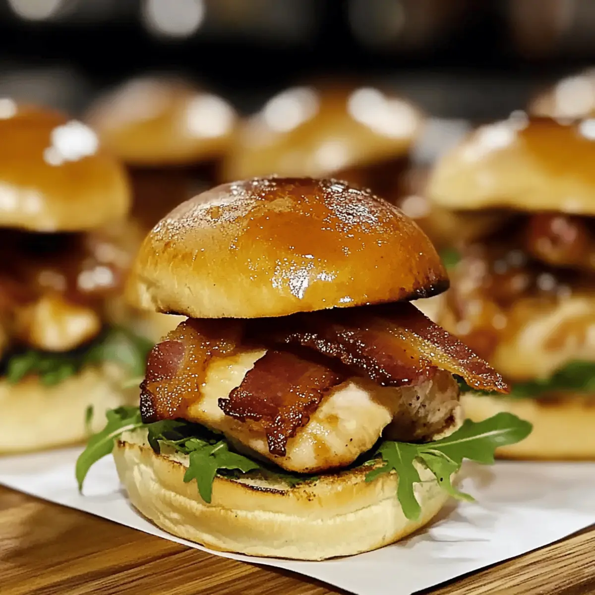 - Assemble the sliders by placing arugula on each toasted bun, topped with glazed chicken and a slice of crispy beef bacon. Crown with the top bun.