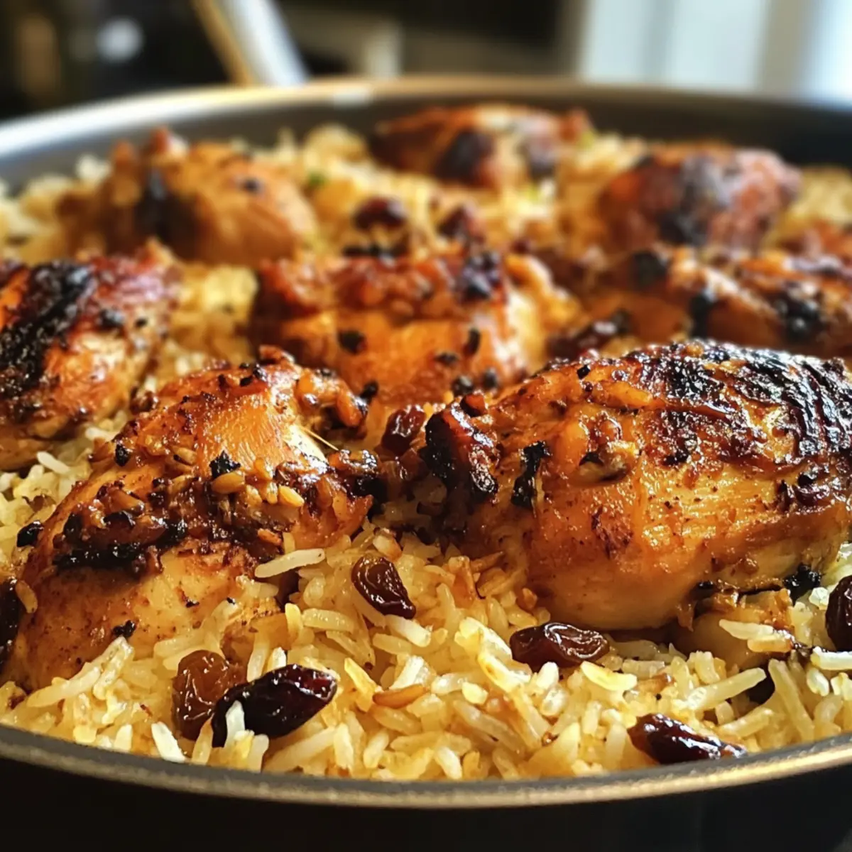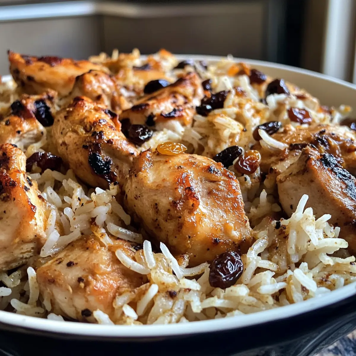 Once the chicken is browned, remove it temporarily and add 2 cups of rinsed basmati rice and 1 cup of raisins. Pour in 4 cups of water and season with salt. Bring the mixture to a boil. Once boiling, lower the heat, cover, and simmer for 10-15 minutes until the rice is tender and fluffy.