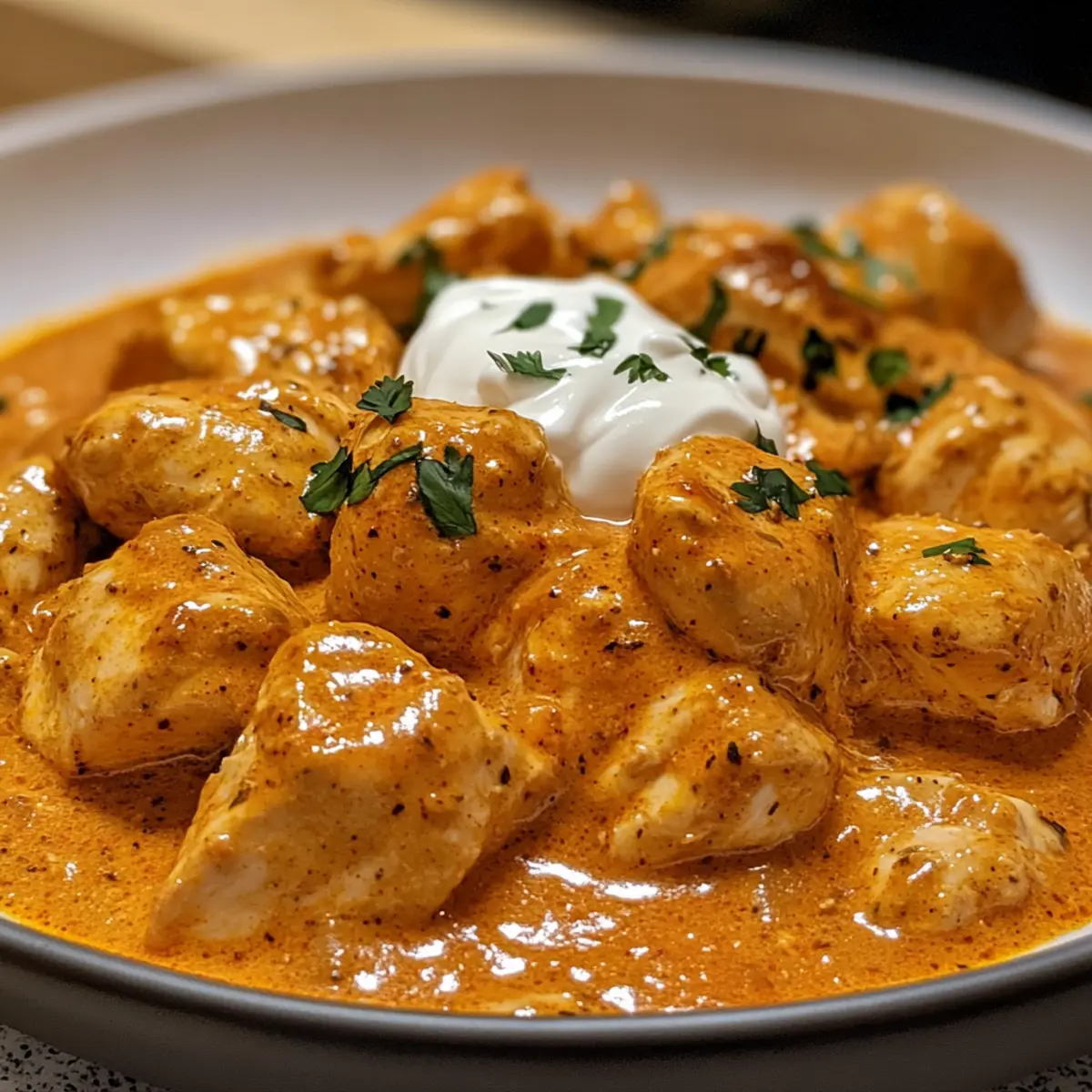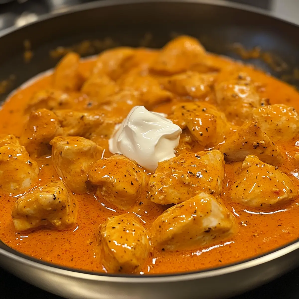 After 45 minutes, mix the reserved flour with sour cream and a half cup of the hot chicken stock to temper the sour cream, avoiding curdling. Stir this mixture into the pot, allowing it to thicken the sauce. Simmer for an additional 5 minutes, stirring occasionally until the sauce achieves a pale orange hue and clings to the chicken beautifully.