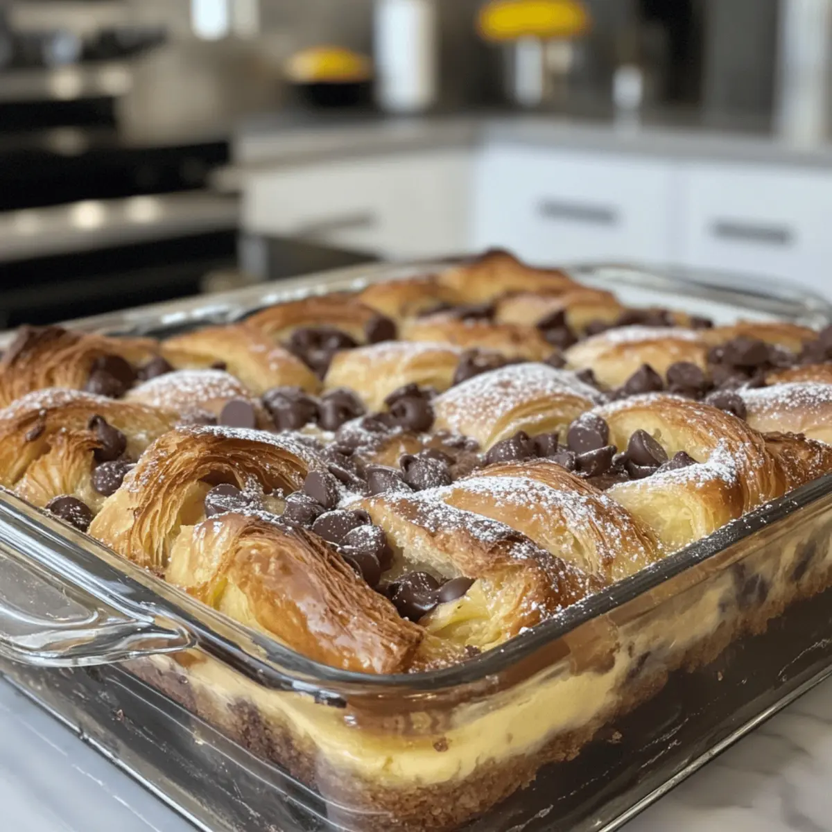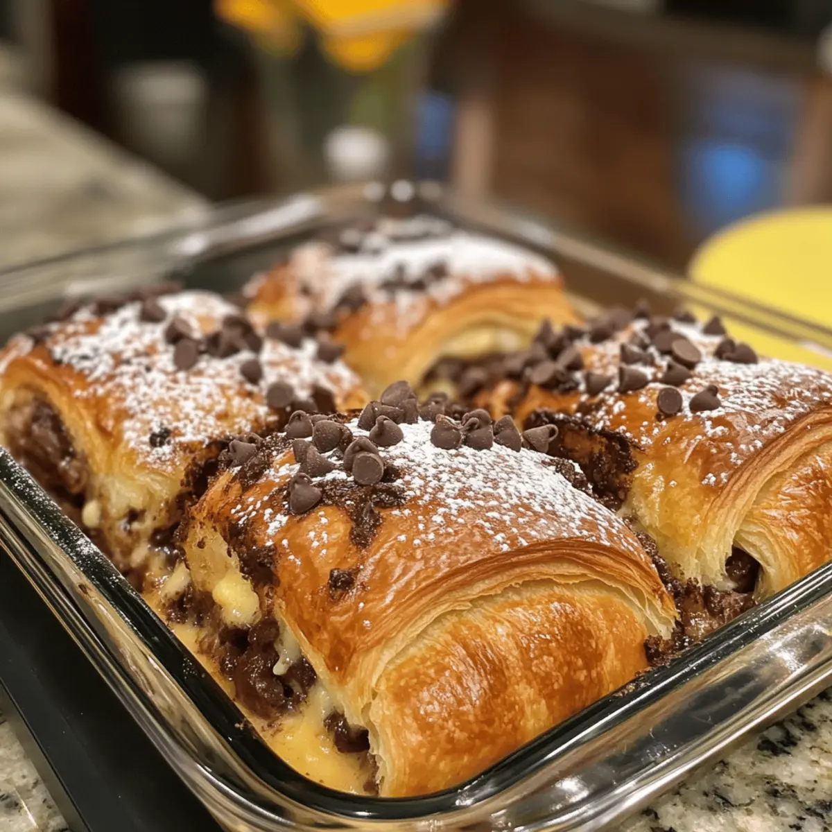 Decadent Layers: This Chocolate Croissant Breakfast Bake features buttery, flaky croissants soaked in a rich custard, ensuring every bite is a delight.
