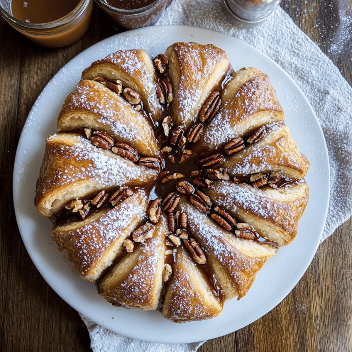 While the bread is baking, make the pecan caramel sauce by combining 1 cup of sugar, 1/2 cup of unsalted butter, and 1/2 cup of heavy cream in a saucepan over medium heat. Stir continuously until bubbling and thickened, about 5–7 minutes. Once thickened, add in 1 cup of chopped pecans for that lovely crunch and remove from heat.