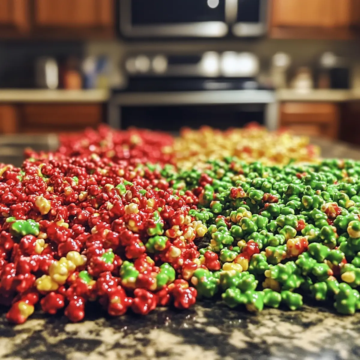 - Once both red and green puffcorn have dried, gently mix them together in a large serving bowl.