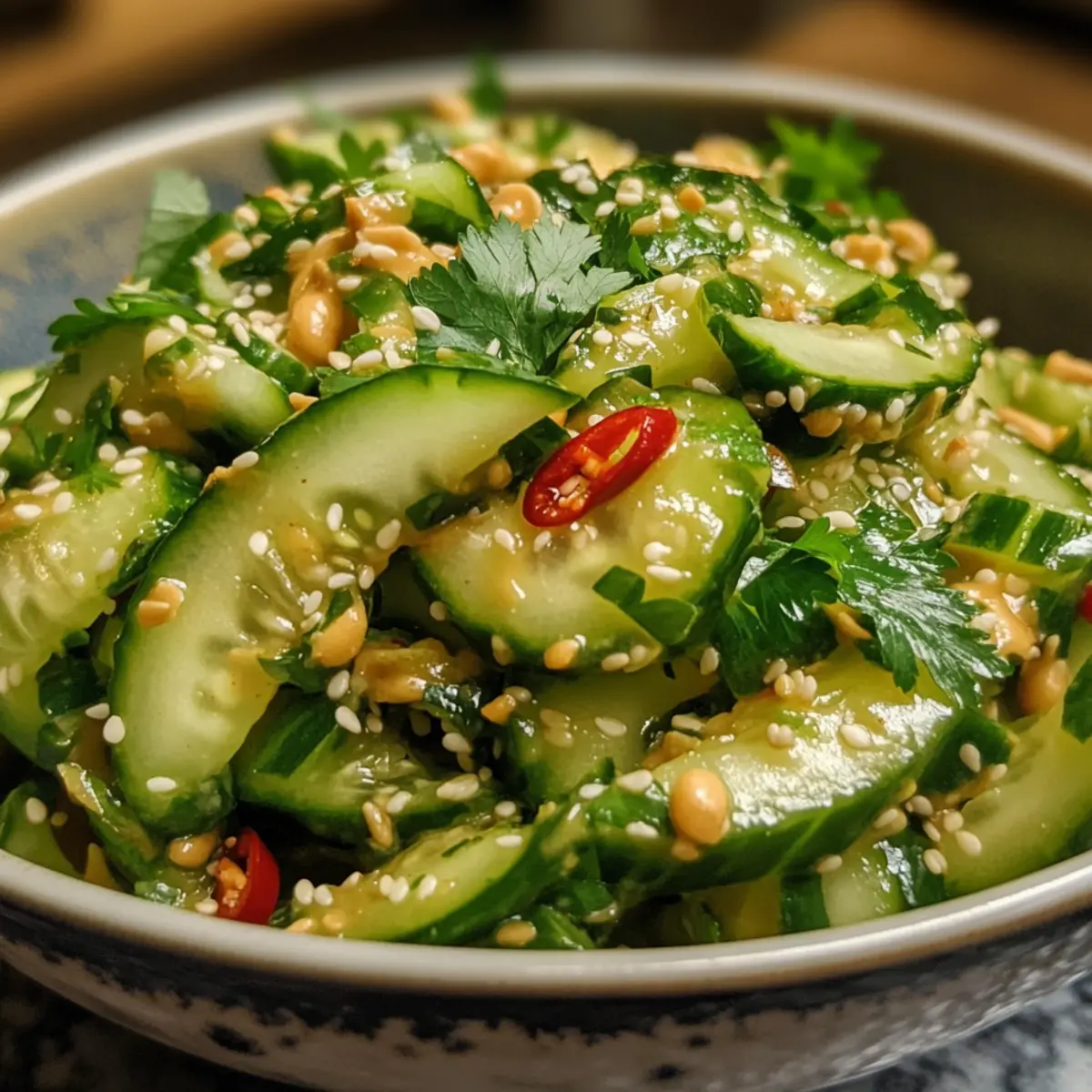 Once combined, transfer the salad to a serving bowl or individual plates. For an elegant touch, sprinkle additional toasted sesame seeds on top. This Cucumber Peanut Butter Salad is best served immediately to preserve the crispness of the cucumbers and the vibrant flavors. Enjoy the delightful combination of textures and tastes!