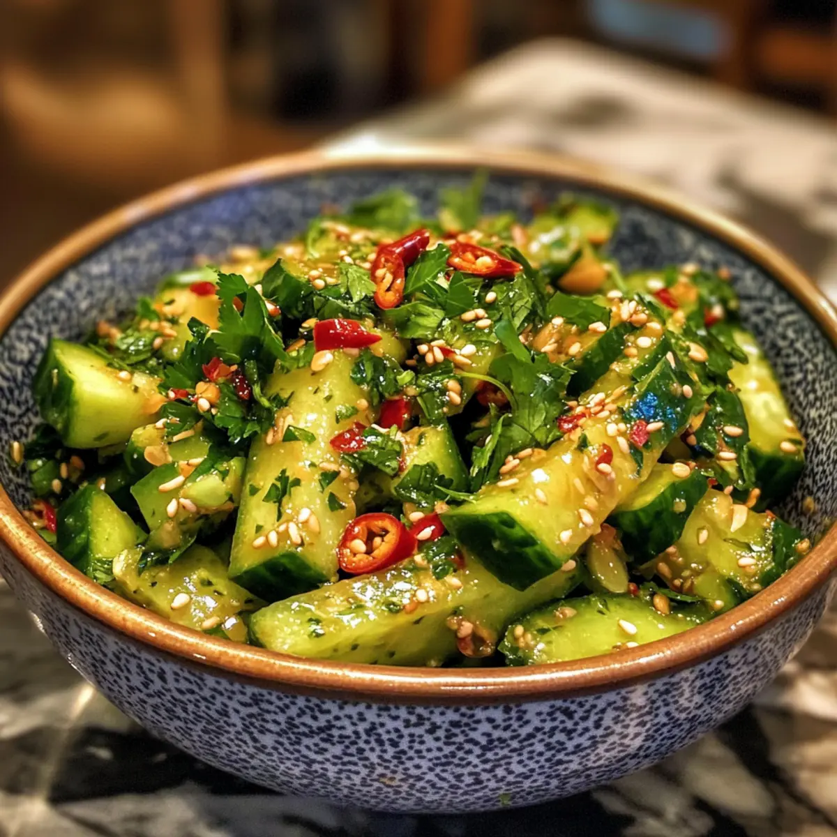 Chop a handful of fresh parsley and finely slice 1-2 fresh chilies according to your heat preference. Add these vibrant ingredients to the bowl of cucumbers along with a sprinkle of toasted sesame seeds for that extra crunch. Gently stir the salad components together until well combined, showcasing a colorful medley.