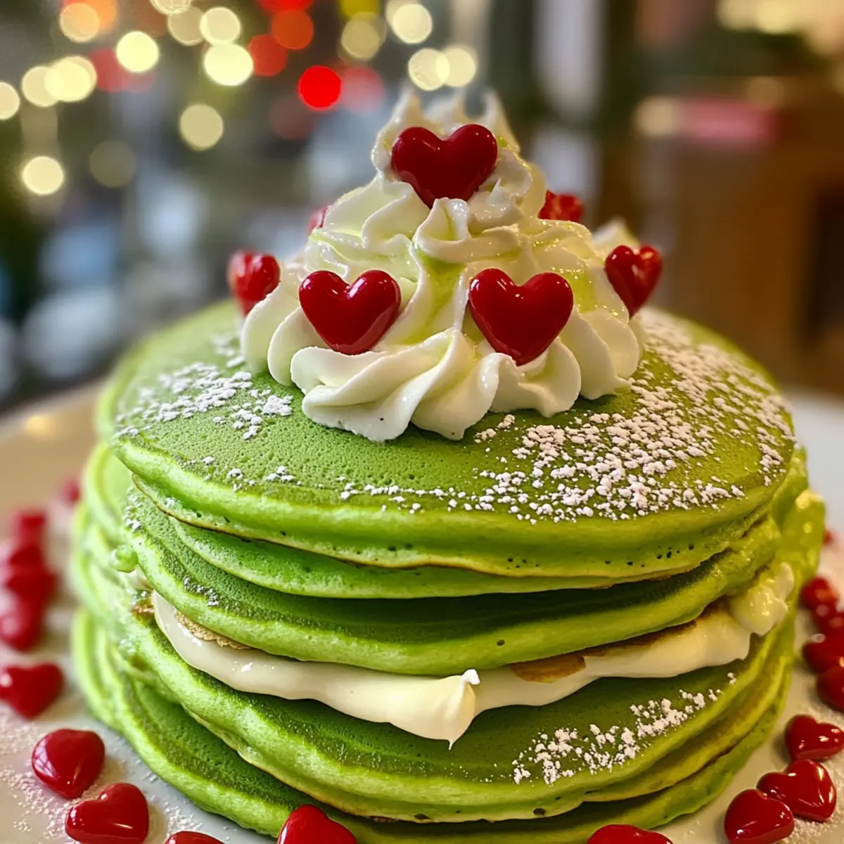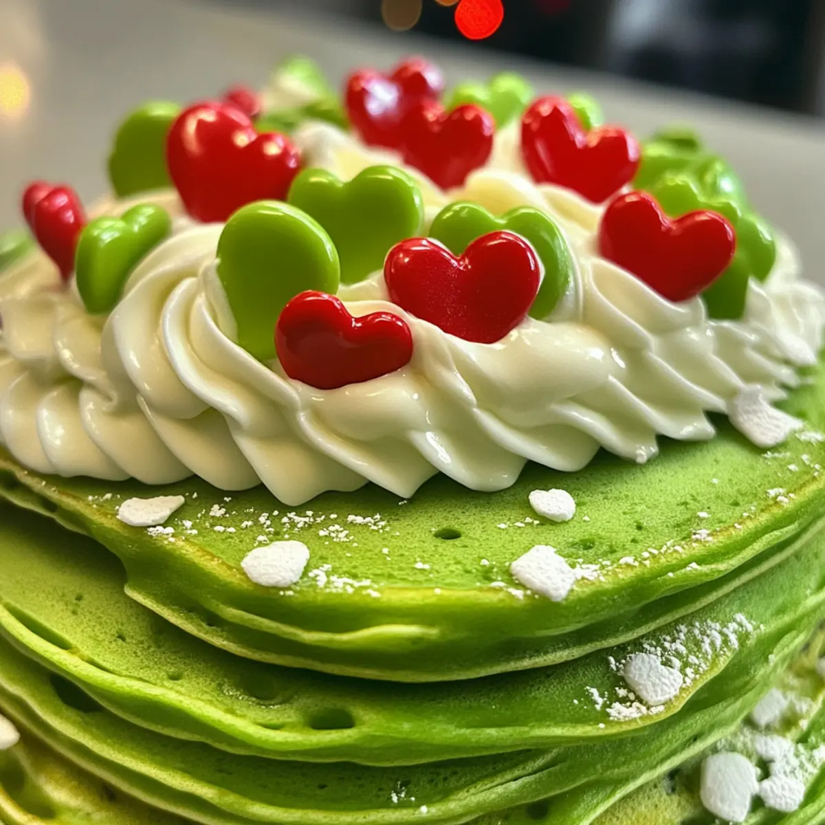 Stack your freshly cooked Grinch pancakes on a serving plate, generously topping them with the creamy cream cheese icing you prepared earlier. Add a swirl of the vibrant green whipped cream over the top. Finally, sprinkle festive red heart candies or sprinkles on your pancakes to make them visually stunning and festive. Serve these delicious Grinch pancakes warm and enjoy the holiday cheer!