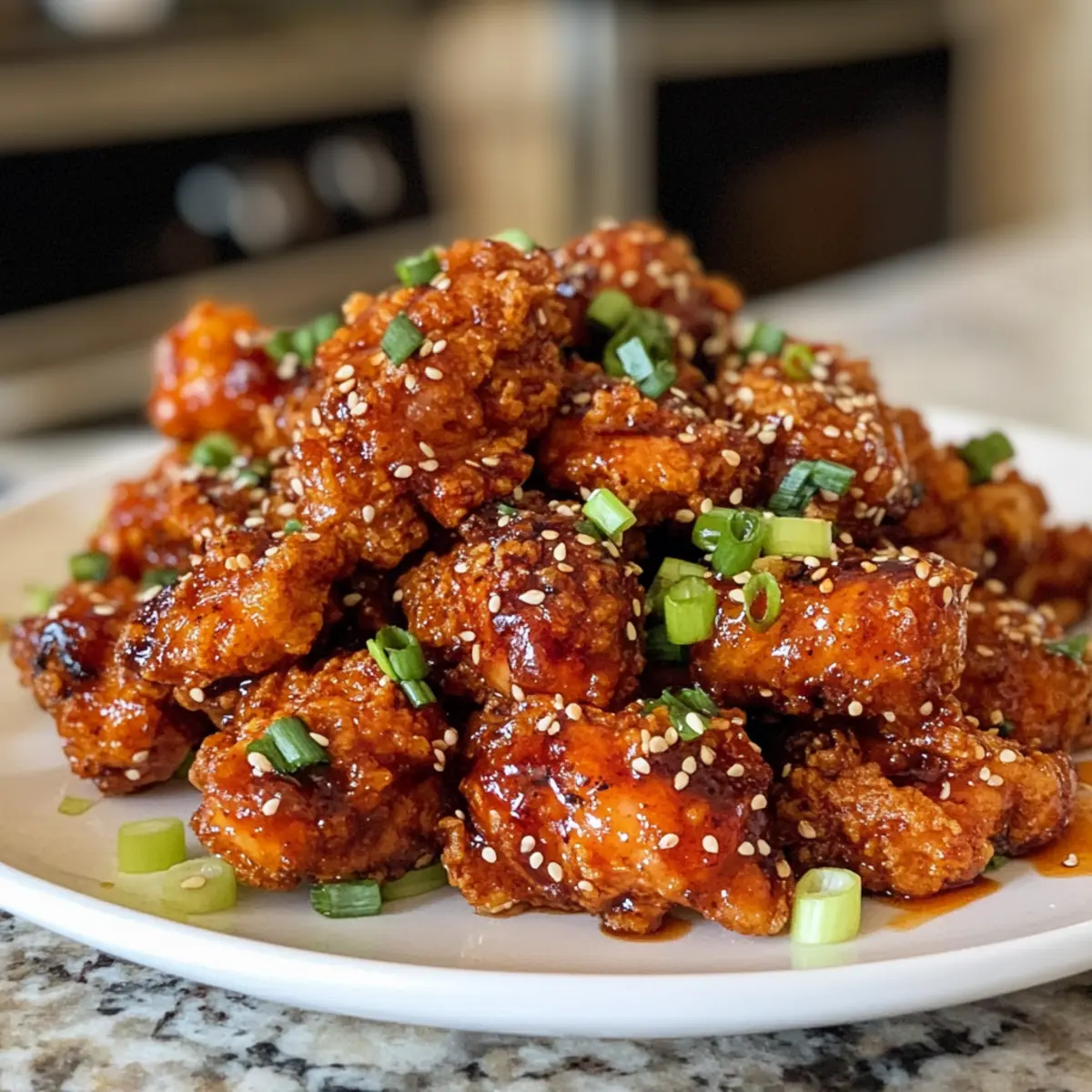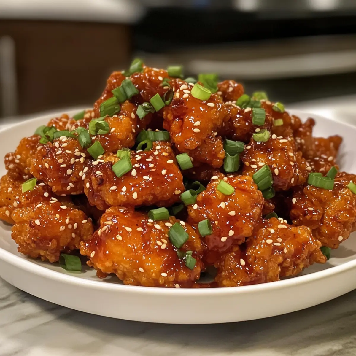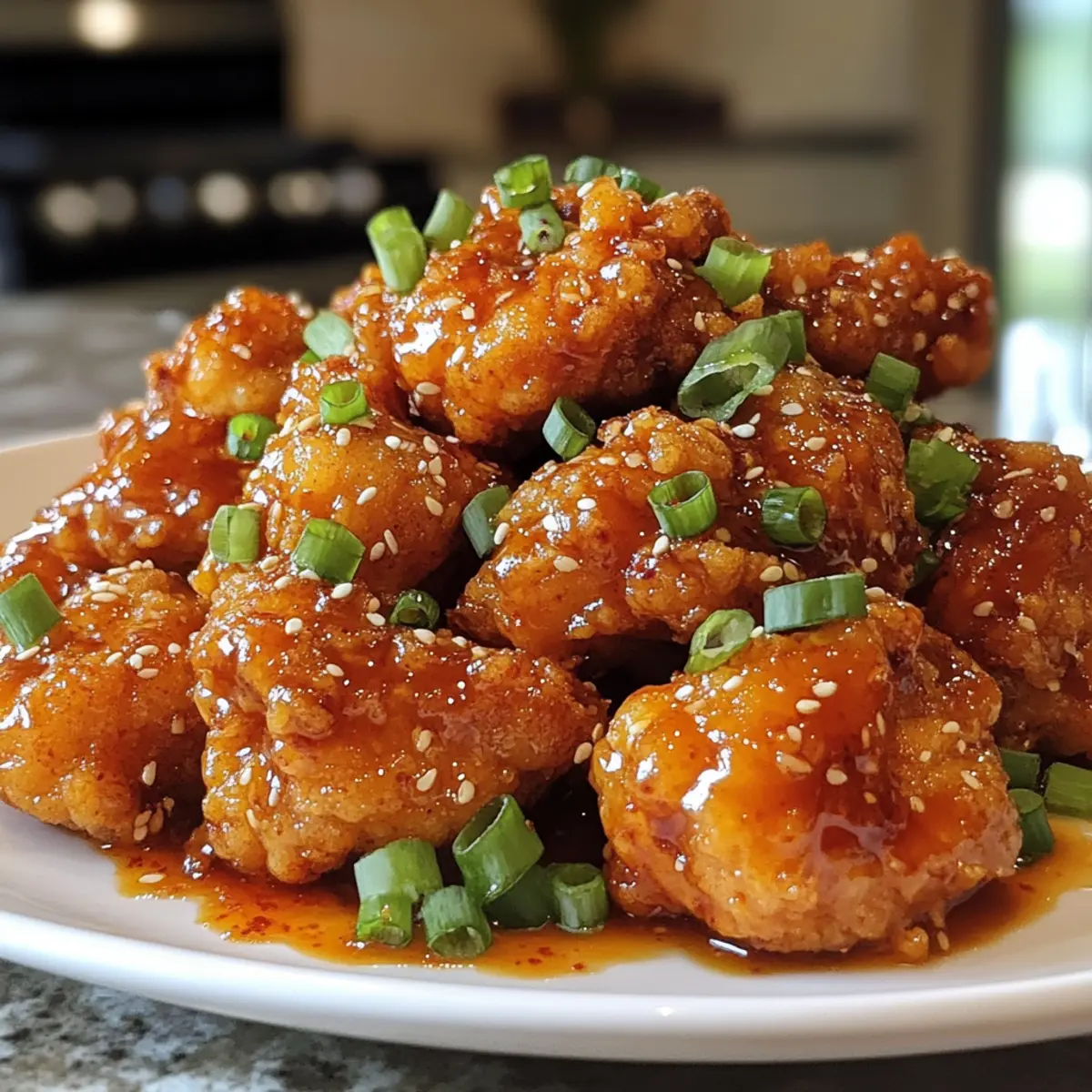 - While the chicken is still hot, toss it gently in the prepared sauce until every piece is evenly coated. Transfer to a serving dish, and garnish with sesame seeds for added texture and visual appeal.