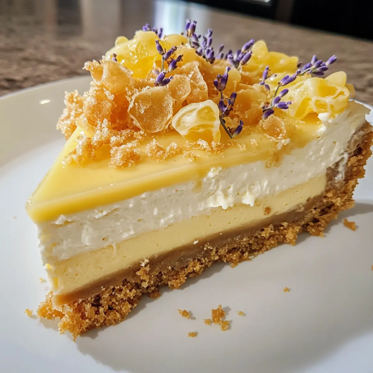 Just before serving, carefully remove the cheesecake from the springform pan. Generously top it with honeycomb pieces for a delightful crunch, and drizzle with honey or a vegan honey alternative if desired. Garnish with additional lemon zest and a sprinkle of lavender buds to enhance both visual appeal and flavor, creating an unforgettable final touch!