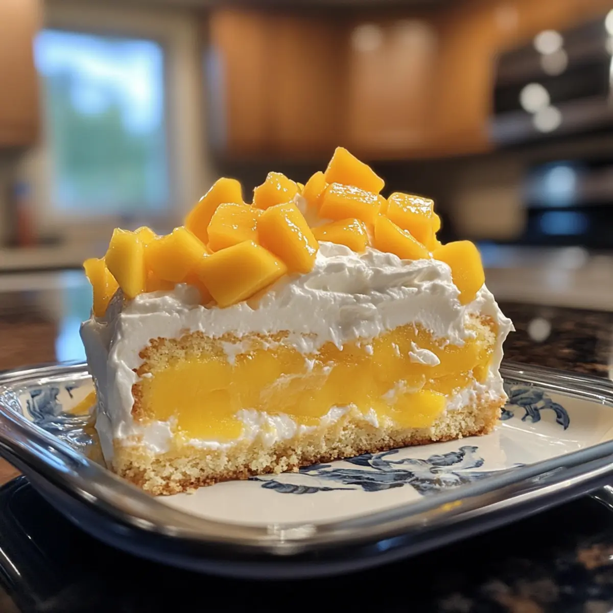 Before serving the Mango Tres Leches Cake, top it generously with 1-2 ripe mangoes, diced into small pieces. For an extra touch of luxury, add a dollop of whipped cream made from heavy cream, whipped to soft peaks. Optionally, garnish with fresh mint leaves for a bright, aromatic finish that enhances the tropical vibes.