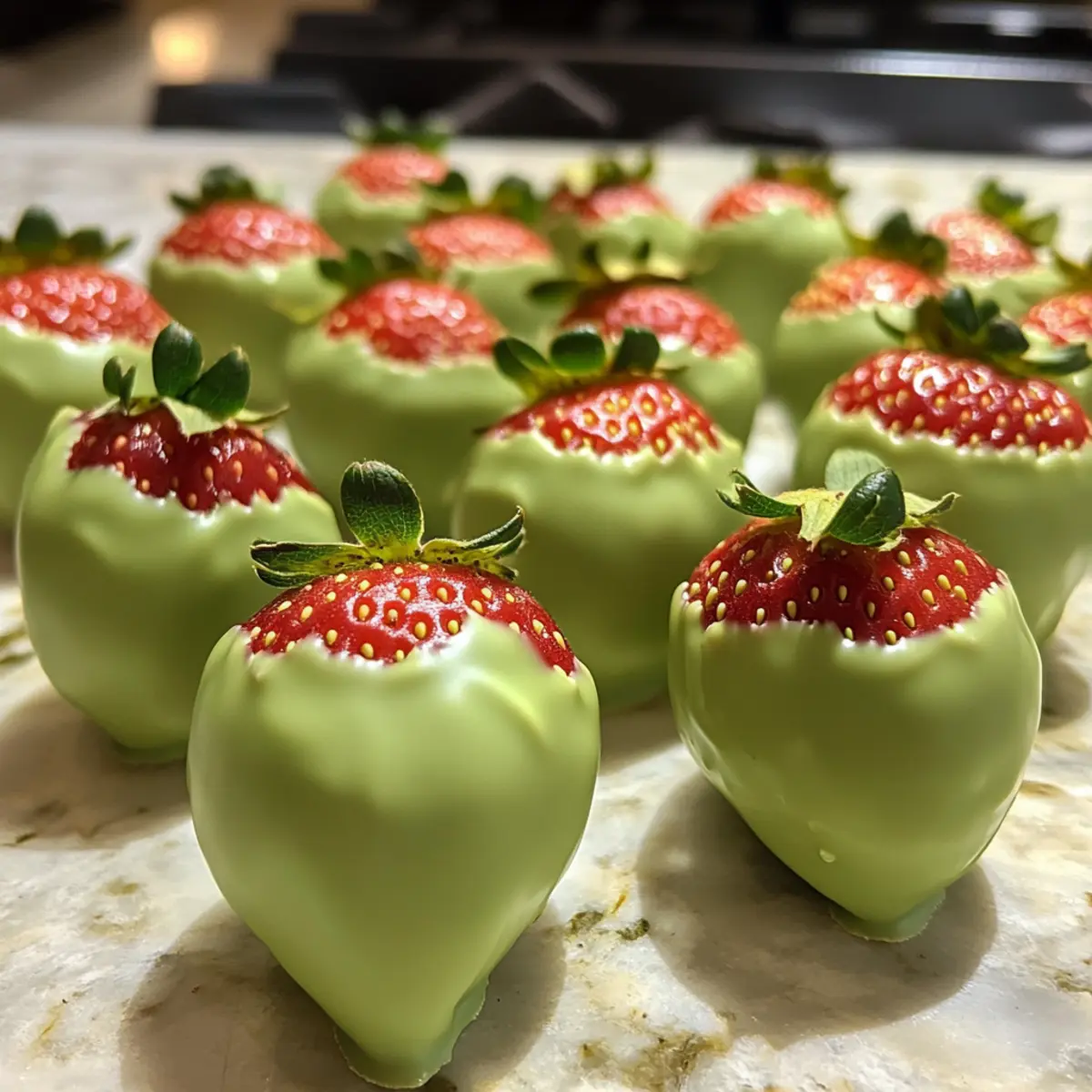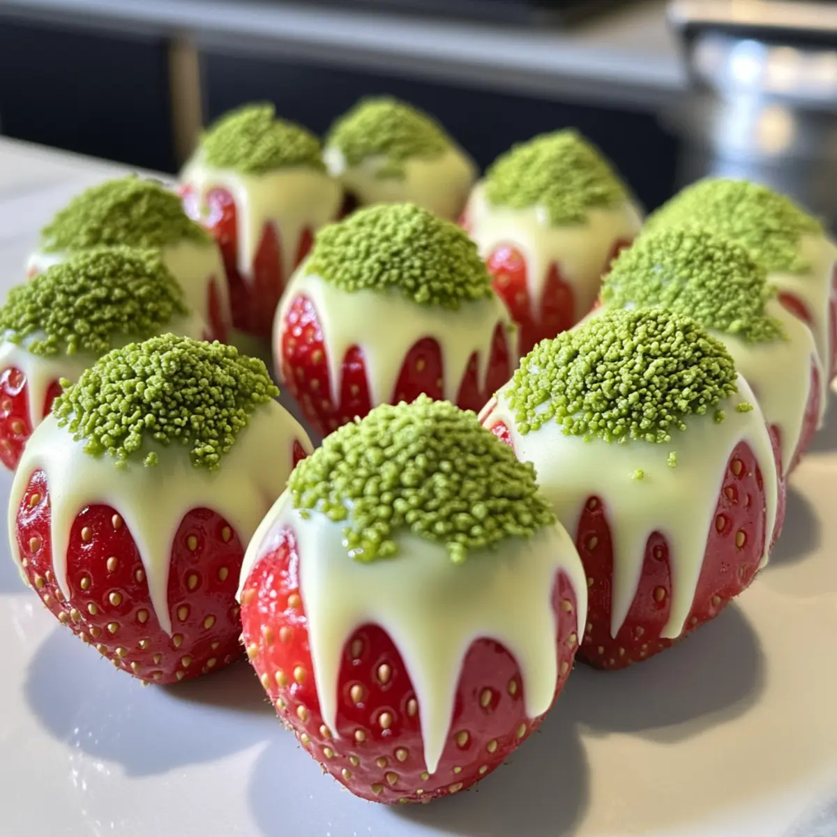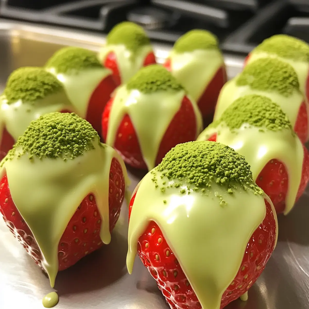 A delightful treat featuring fresh strawberries coated in rich white chocolate and vibrant matcha powder, perfect for any occasion.