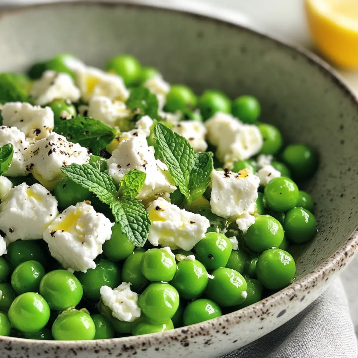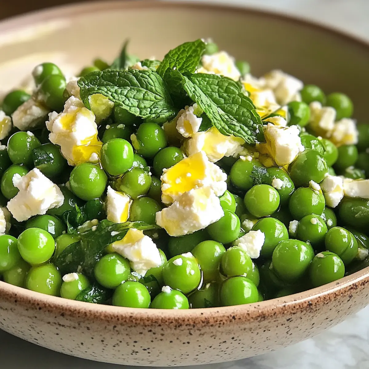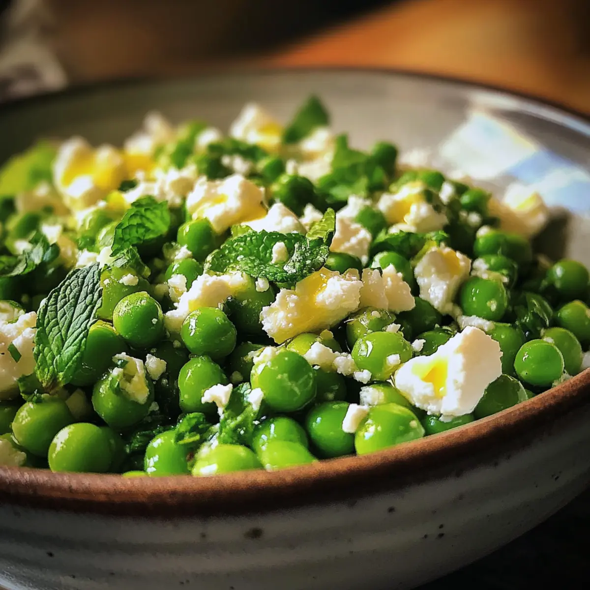 • Feta (crumbled) – Adds creaminess and saltiness to balance the sweetness of the peas; substitute with goat cheese for a similar texture or freshly grated parmesan for a richer flavor.
