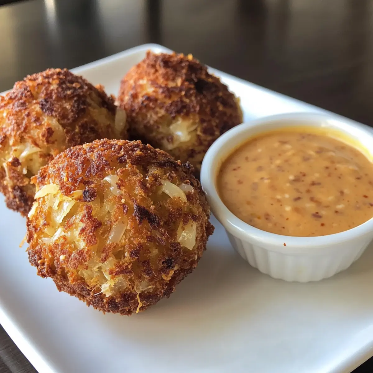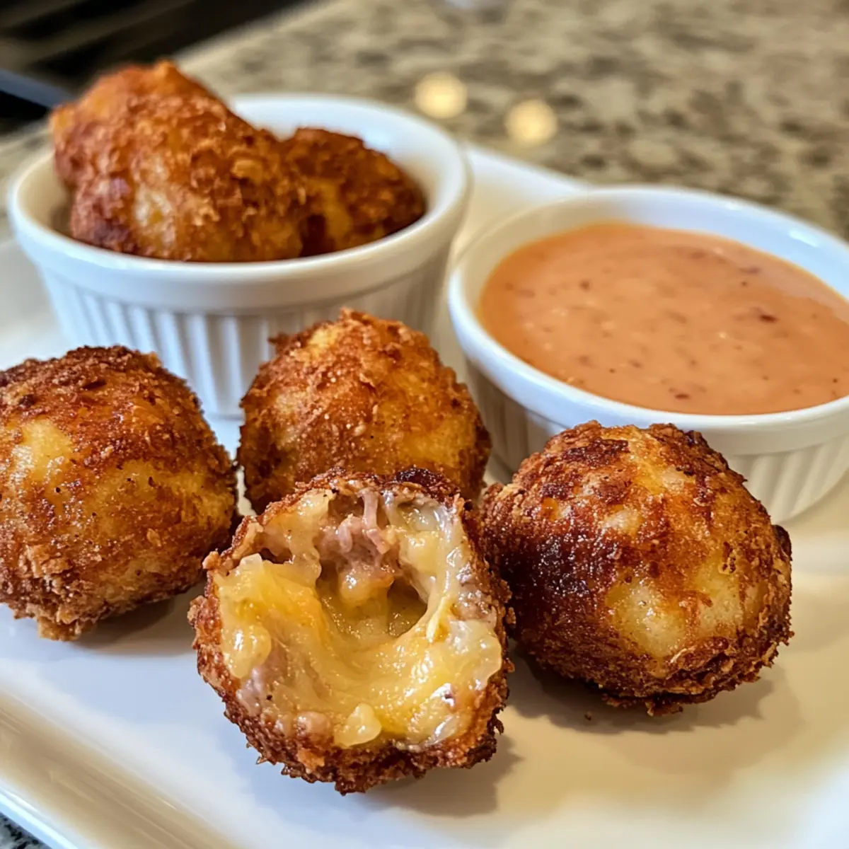 7. Serve the crispy Reuben Balls hot with the dipping sauce.