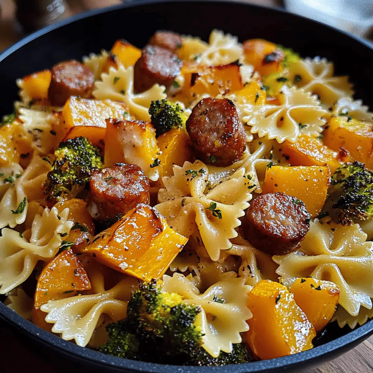 - Return cooked pasta to the skillet, toss to coat with garlic butter, and add roasted butternut squash, Brussels sprouts, and crispy sausage. Mix everything together for 2-3 minutes.