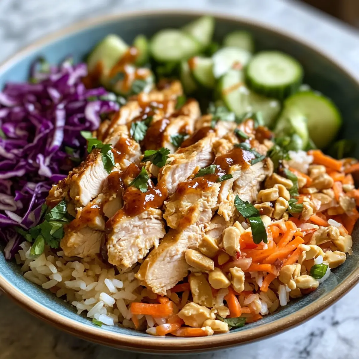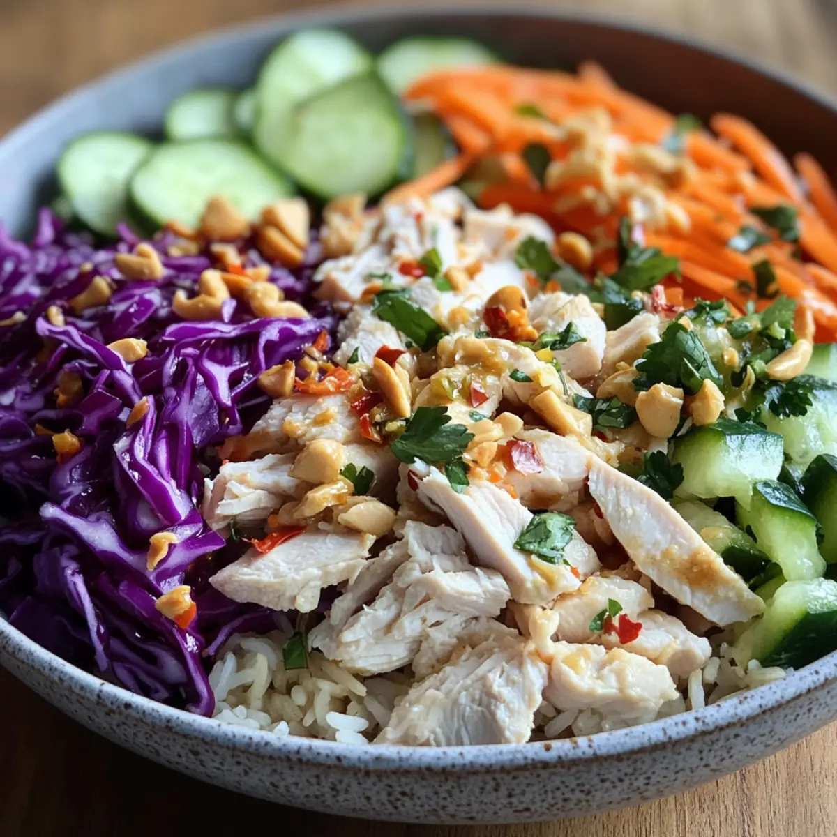 In a large serving bowl, gently mix the crispy rice, cooked chicken, finely sliced red cabbage, julienned carrots, sliced cucumber, and chopped cilantro. Toss everything together with care to maintain the delightful texture of the crispy rice while ensuring that all the ingredients are evenly distributed throughout the bowl for your Savor Chicken Crispy Rice Salad.