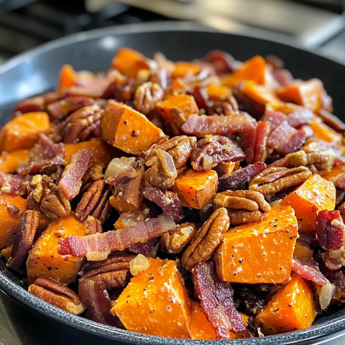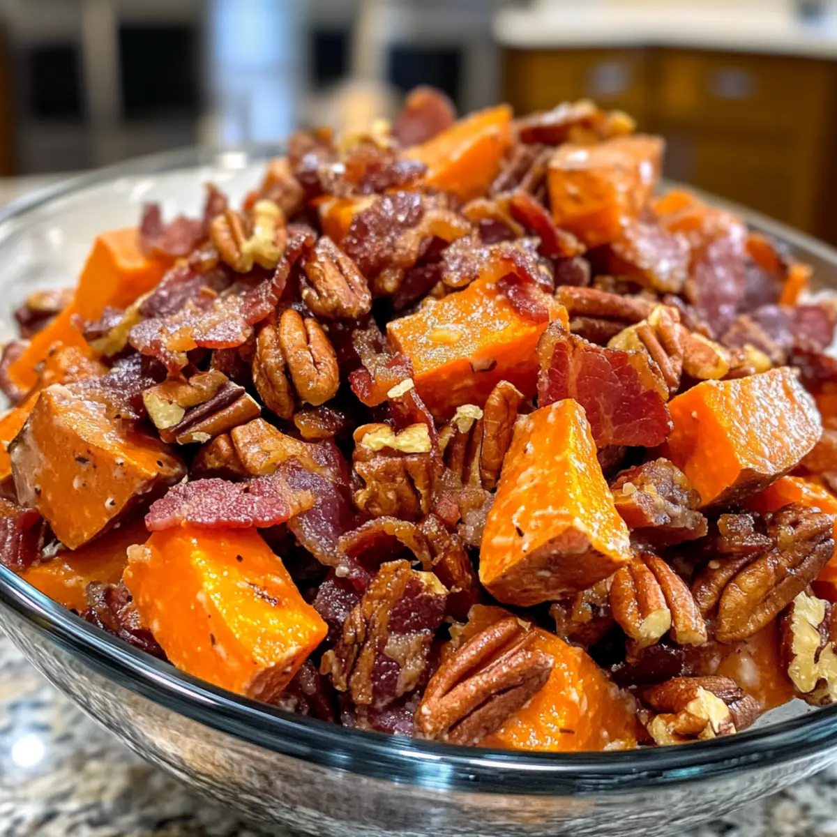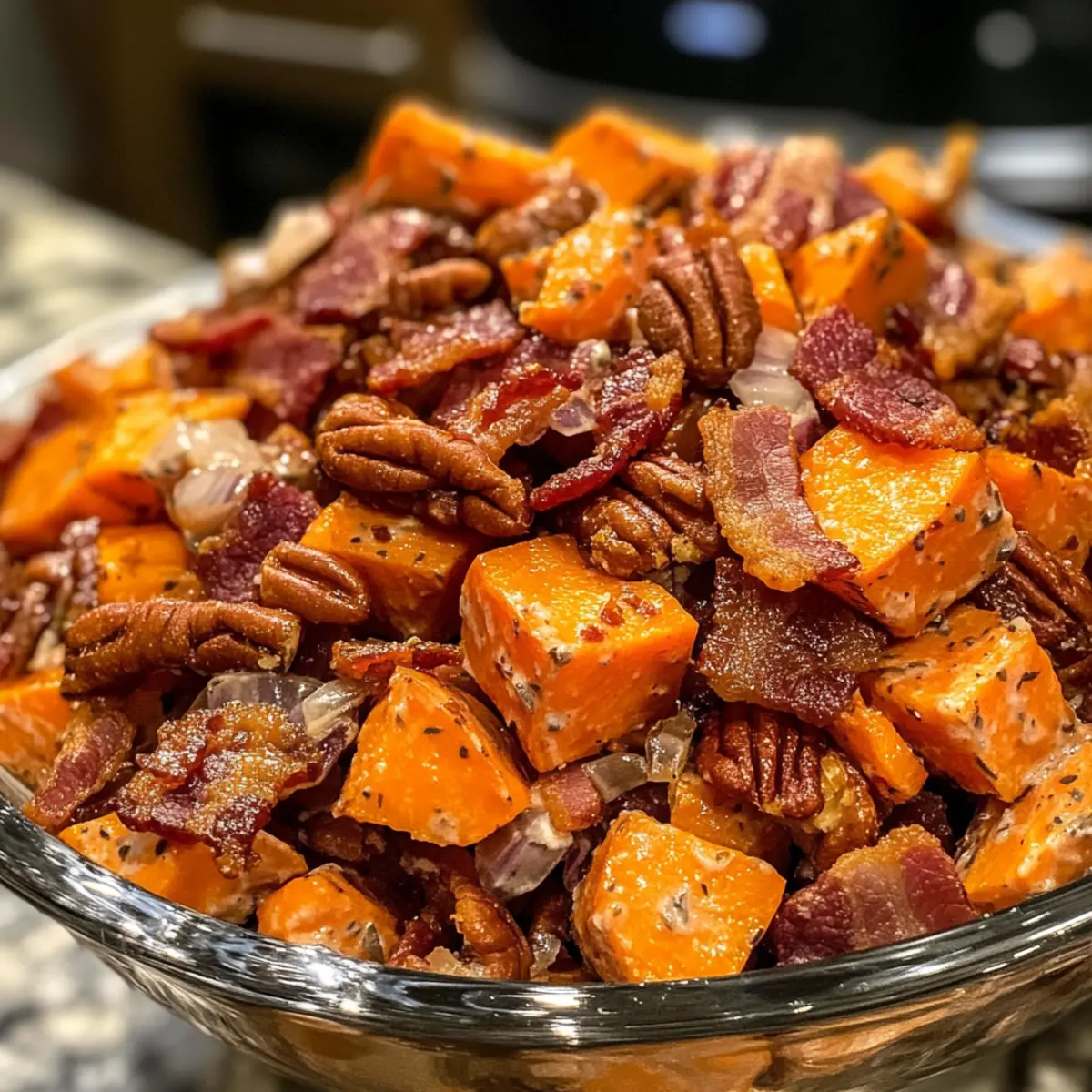 Unique Twist: The addition of crispy bacon and crunchy pecans elevates the traditional sweet potato salad, giving it a gourmet touch that’s sure to impress.