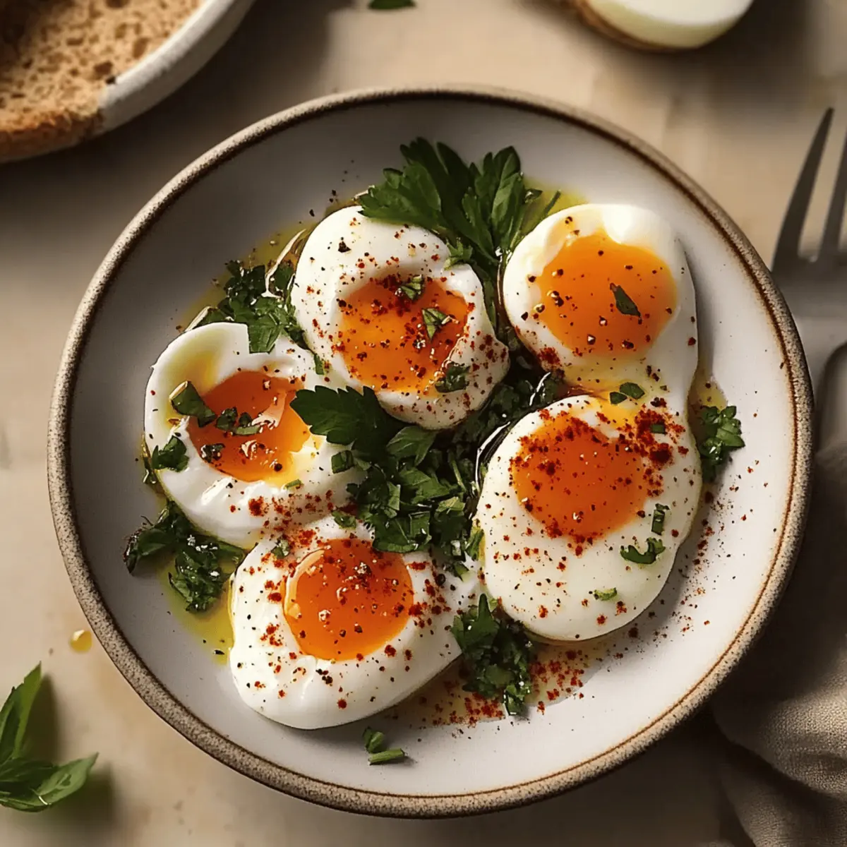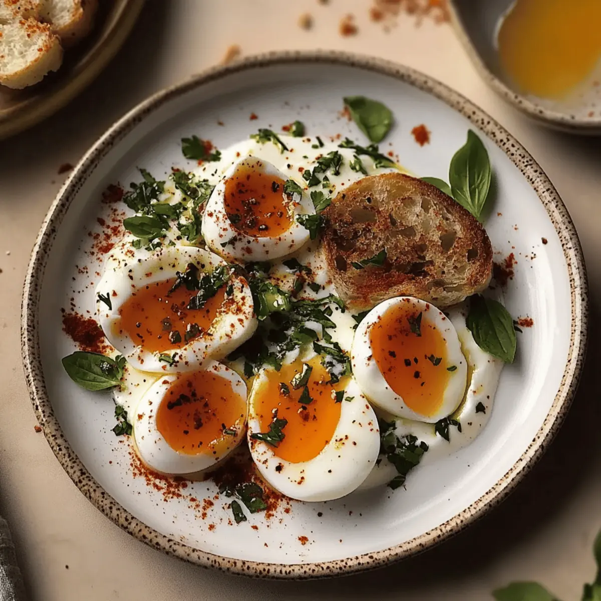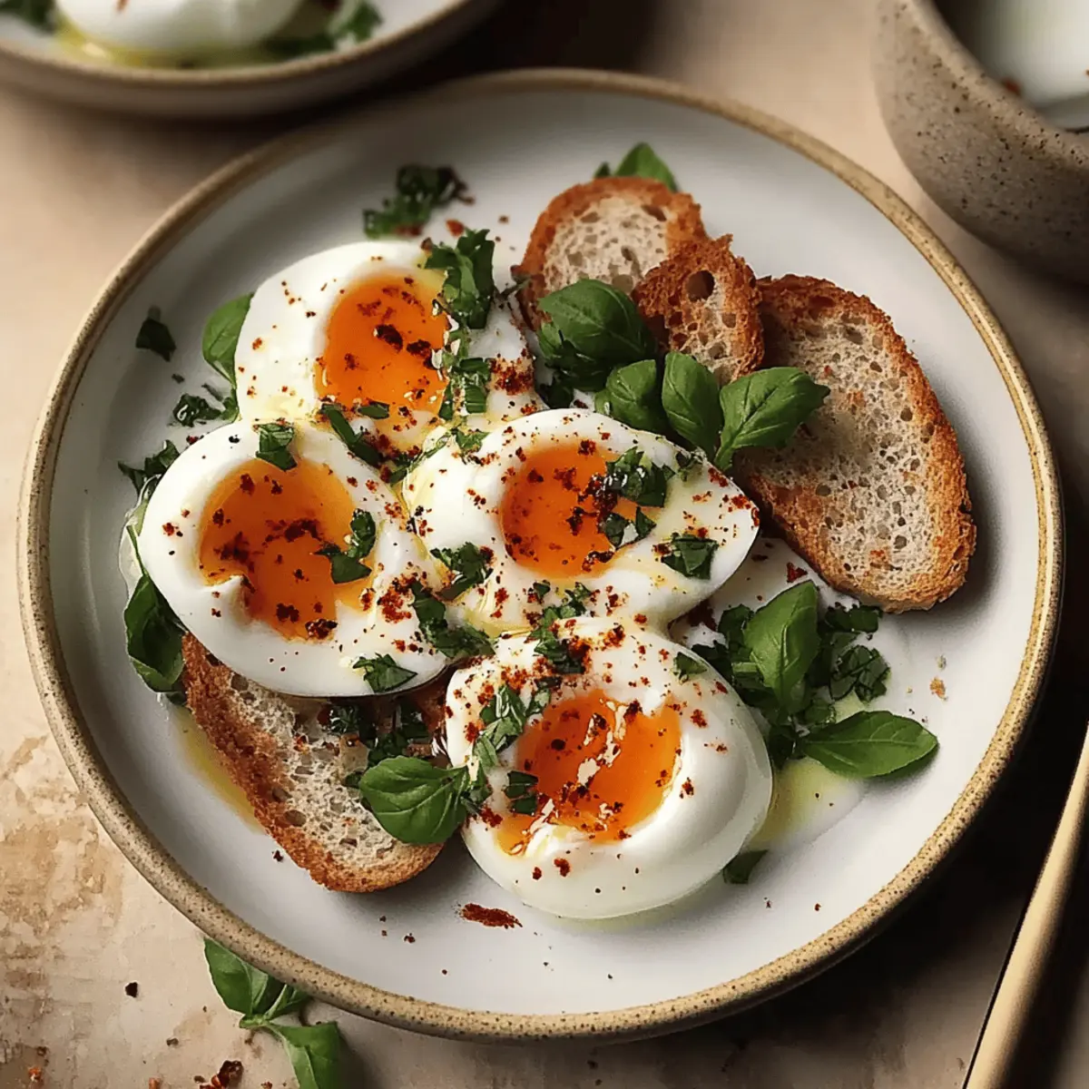 Presentation Tip: For an elegant touch, swirl the herbed yogurt on the plate before adding the poached eggs. A little extra garnish, like fresh herbs, elevates the overall appearance of the Turkish Eggs Delight.