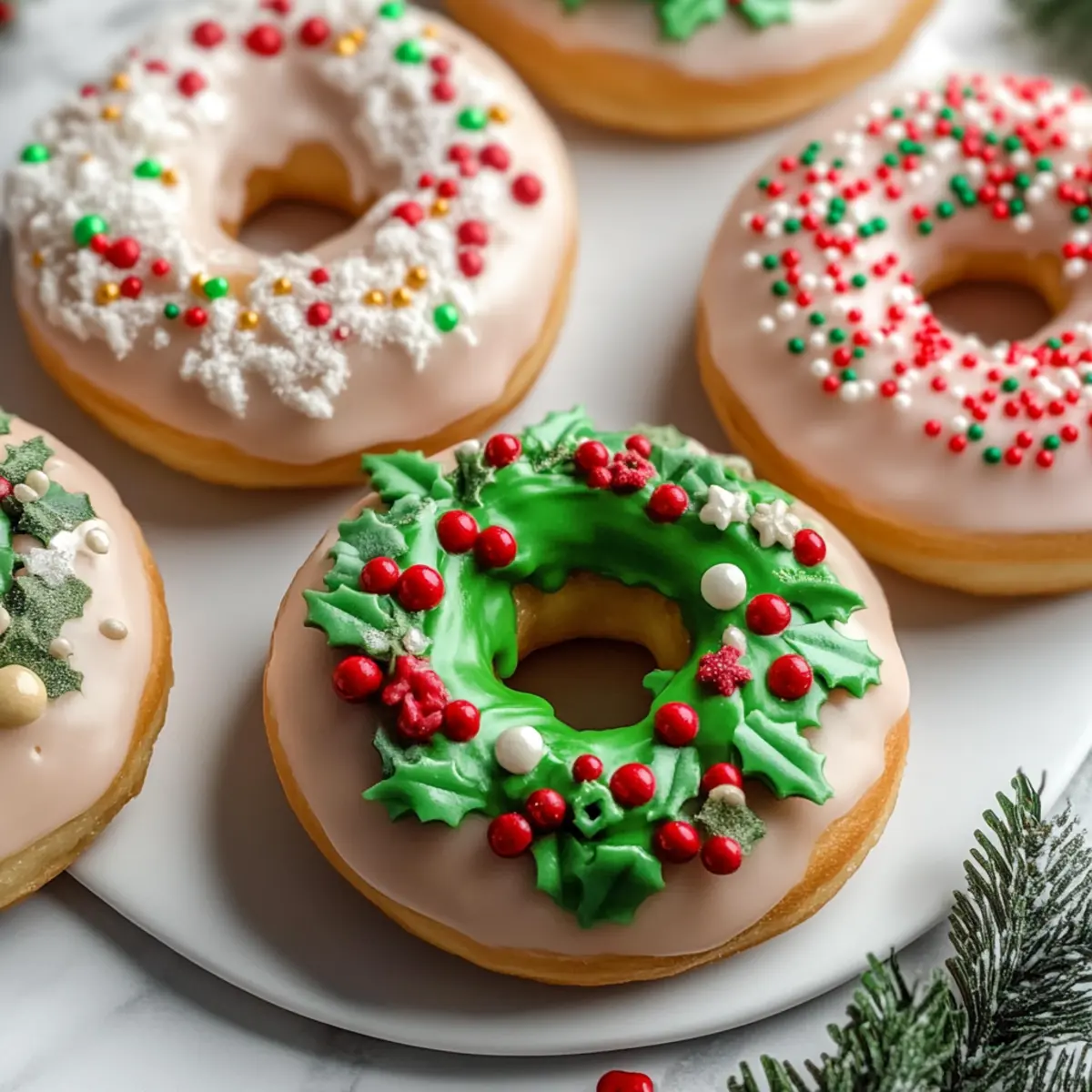 - Pipe the buttercream in a wreath shape on the glazed doughnuts and top with sprinkles or mini red candies.