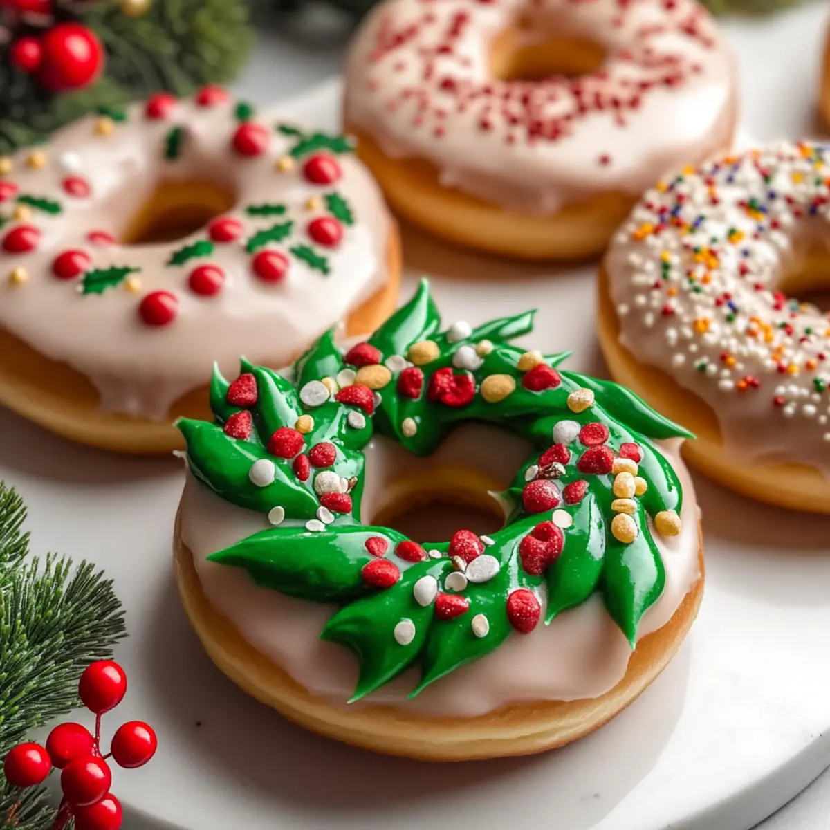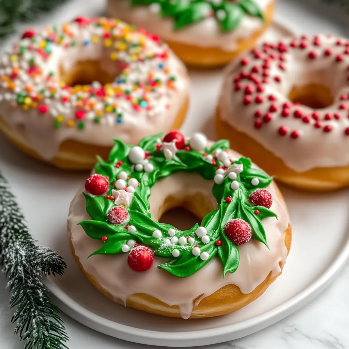 For the buttercream, beat dairy-free butter until fluffy, then gradually add icing sugar, vanilla extract, and dairy-free milk until pipeable. Tint the buttercream green with the food coloring. Using a piping bag fitted with a star tip, pipe the buttercream in a wreath shape onto the glazed doughnuts, adding sprinkles or mini red candies for a festive touch.
