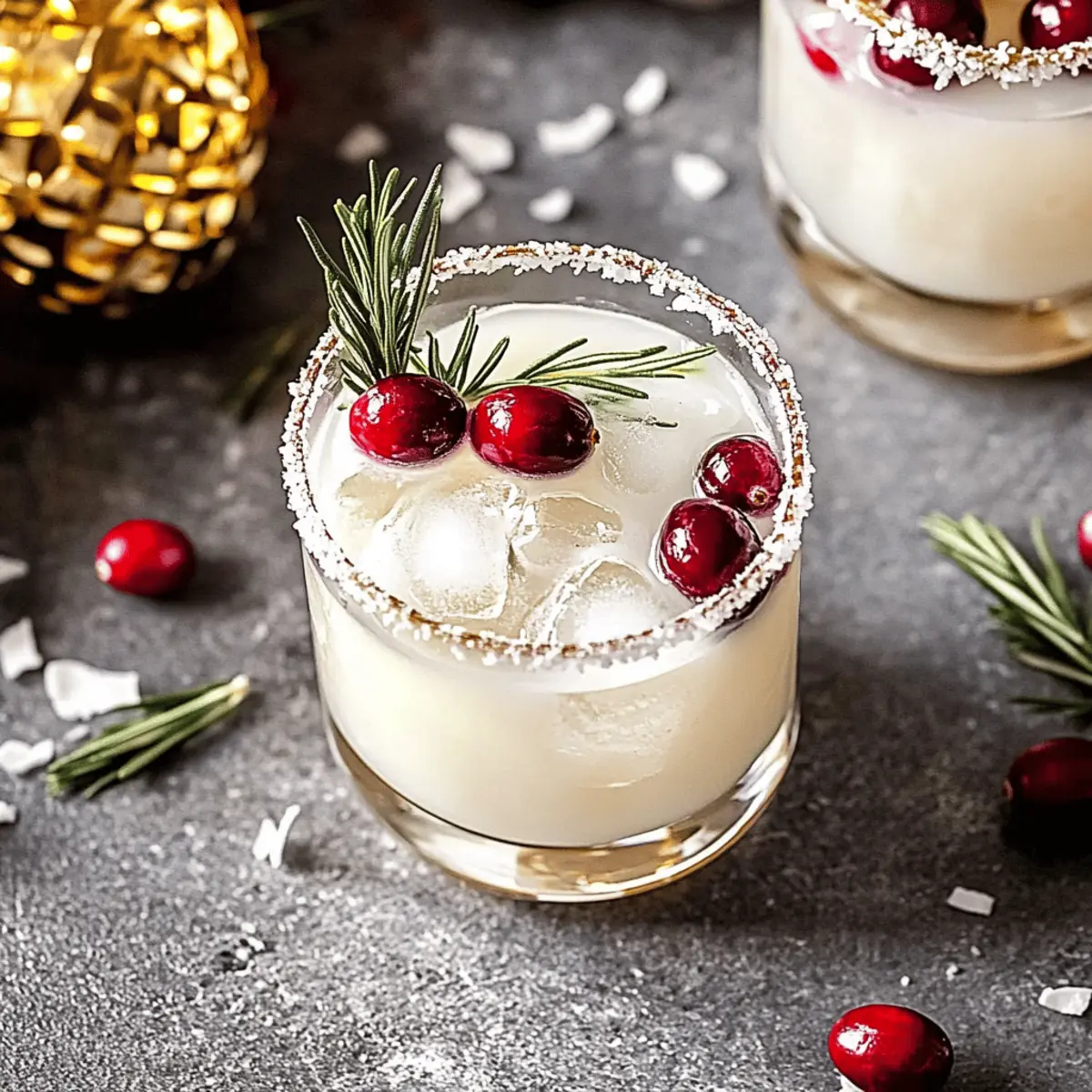 Stunning Presentation: A rim of shredded coconut combined with fresh cranberries and rosemary garnishes turns every glass into a festive centerpiece.